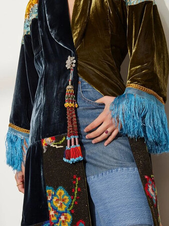 Velvet is back - and this patchworked, fringed, embroidered robe-style masterpiece is a soft, bohemian maximalist’s fever dream. It’s not just the plush, luxurious velvet to thank for that. There’s the wild symphony of colour-blocking and ornate needlepoint tapestry panels in full floral bloom - which always say "I'm here to stay" on a jacket, don't they? The extravagant volume of the long sleeves, finished with playful blue fringe at the cuffs (because why stop at velvet), means there’s something different to admire from every angle. And then there are those jewel and tassel trimmings at the lapel. If you were worried about standing out or drawing attention, you can set those fears aside. If you’re going to go big - why not go really big? This full-length outerwear has a relaxed silhouette that whispers robe while loudly shouting “artisanal”, making it an inspired choice for anyone in need of show-stopping outerwear.